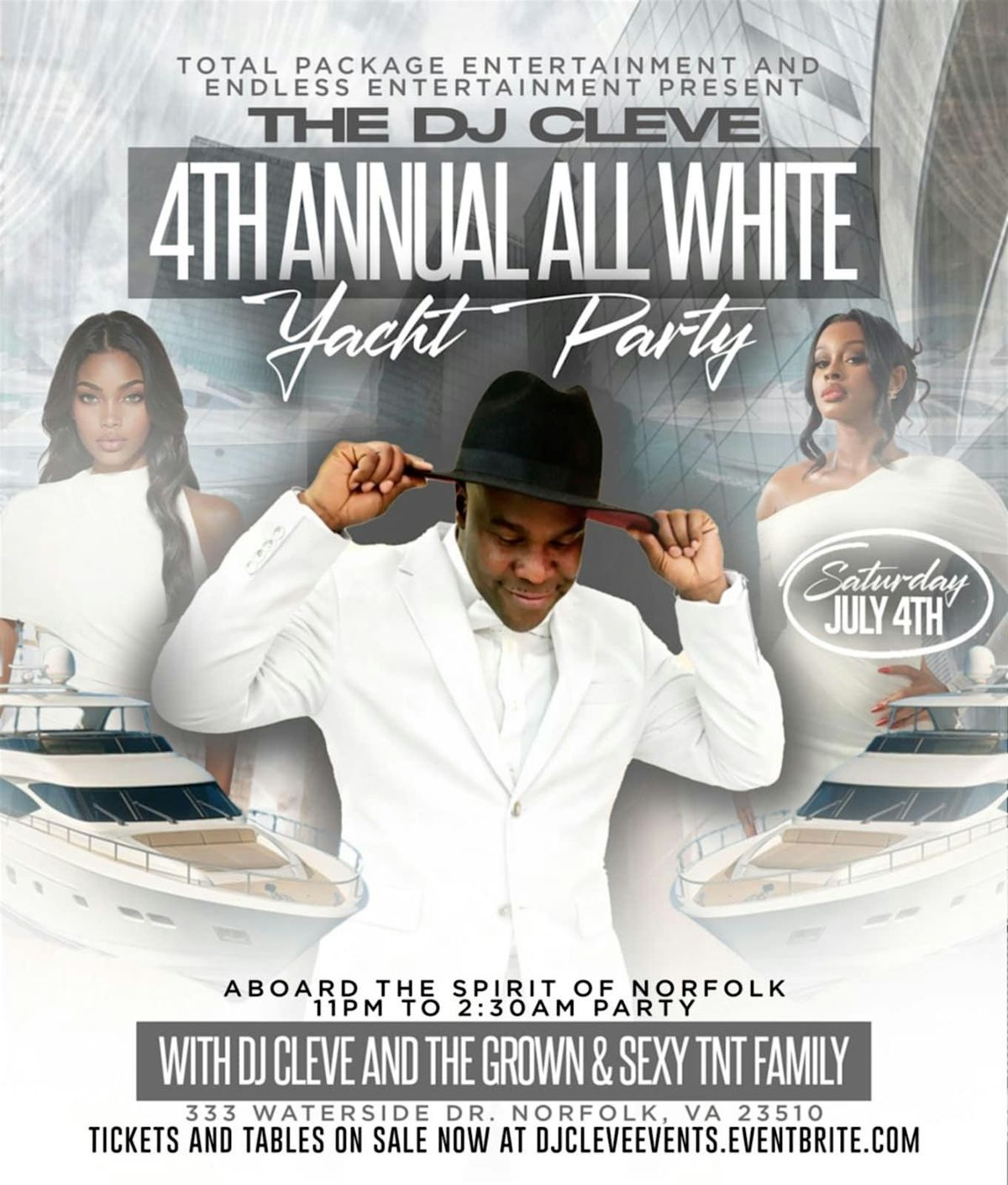 Total Package Entertainment And Endless Entertainment Presents The Dj Cleve 3rd Annual All White Yacht Party Saturday July 4th Aboard The Spirit Of Norfolk 11pm To 2:30amParty With Dj Cleve And The Grown & Sexy TNT Family.. .333 Waterside Dr. Norfolk, VA 23510