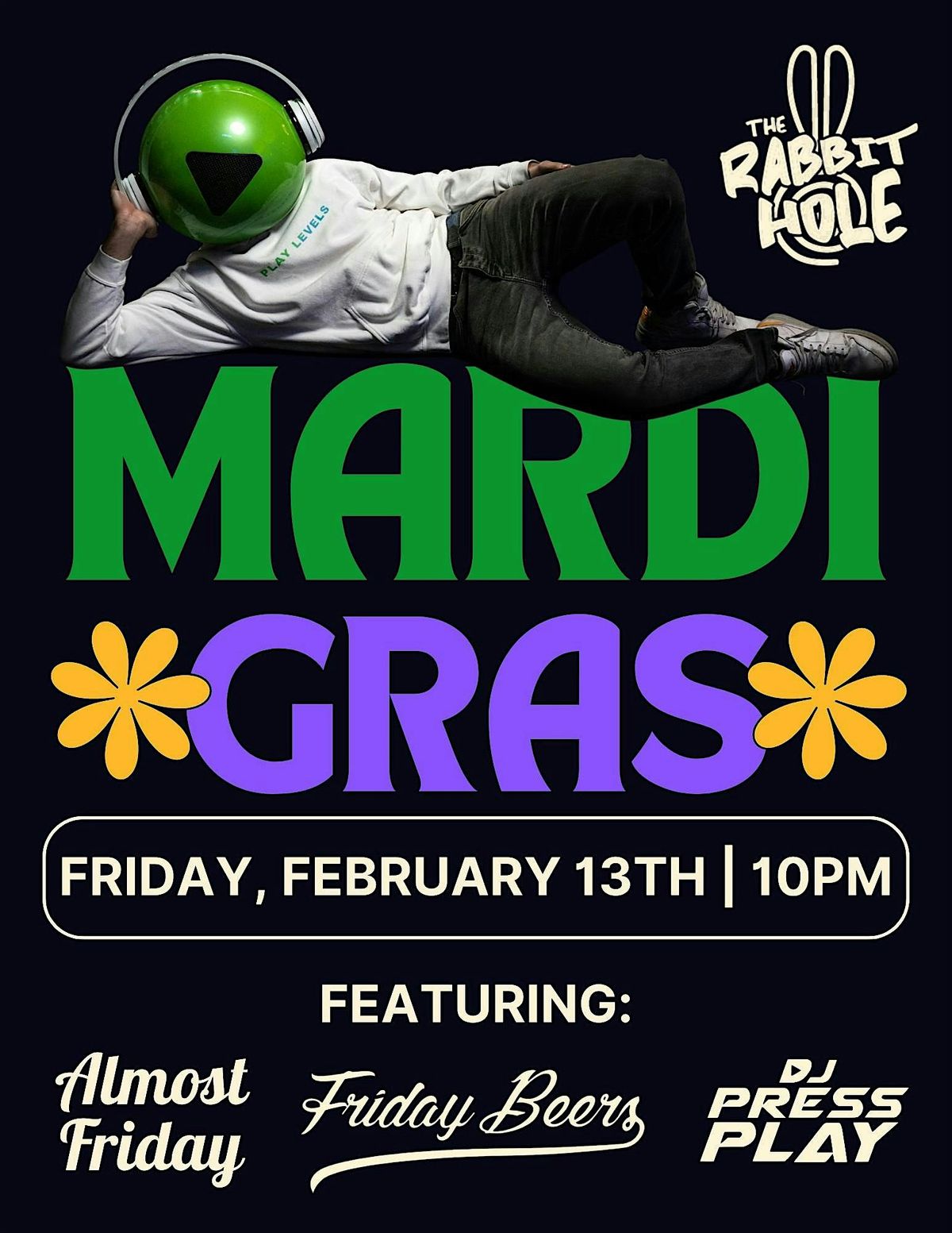 GET READY TO HAVE THE BEST FRIDAY THE 13TH OF YOUR LIFE!!! W/ DJ PRESS PLAY AND HIS FRIENDS FROM VERY GOOD FRIDAY AND FRIDAY BEERS!!!! WHAT BETTER EAY TO START OFF THE MARDI GRAS WEEKEND. WE'RE BRINGING HIM IN FOR MARDI GRAS AS DJ PRESSPLAY'S MUSIC AND VIBE JUST MAKES YOU FEEL HAPPY!!! SEE YA ON THE STREETS!