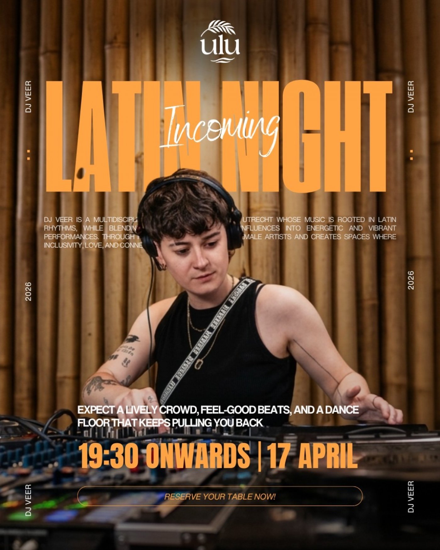 Catch DJ VEER's set at ULU Tapas Bar Utrecht. DJ VEER is a multidisciplinary queer creator from Utrecht whose music is rooted in Latin rhythms while blending different genres and influences into energetic and vibrant performances. Through her work, she highlights female artists and creates spaces where inclusivity, love, and connection are central.