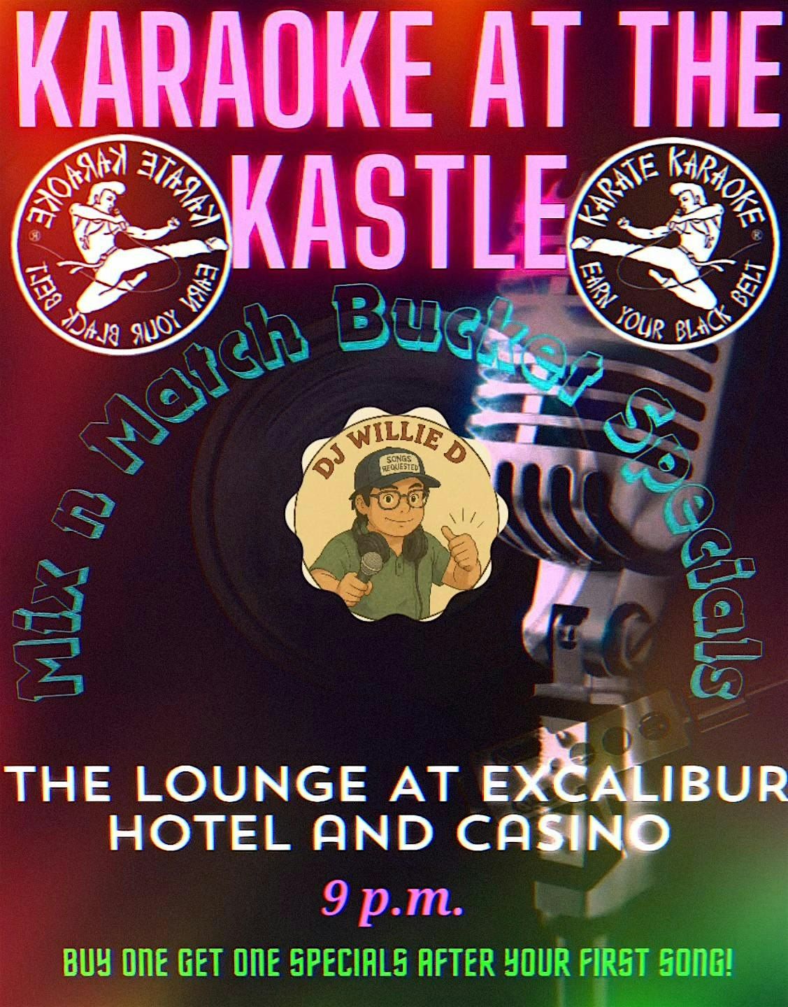 A fun night of Kastle Karaoke that has been running for over 13 years! Karate Karaoke & Eclectiks Entertainment will be hosting at the Excalibur Castle Lounge! WIth regulars both local and from abroad, along with the rowdy "Thunder from Down Under Ladies!" and... YOU to get the party going! Plenty of space for seating and dancing! Register and request through this platform, YouTube, Instagram, Facebook, Popl, and much more! More details below and on the other social media outlets!