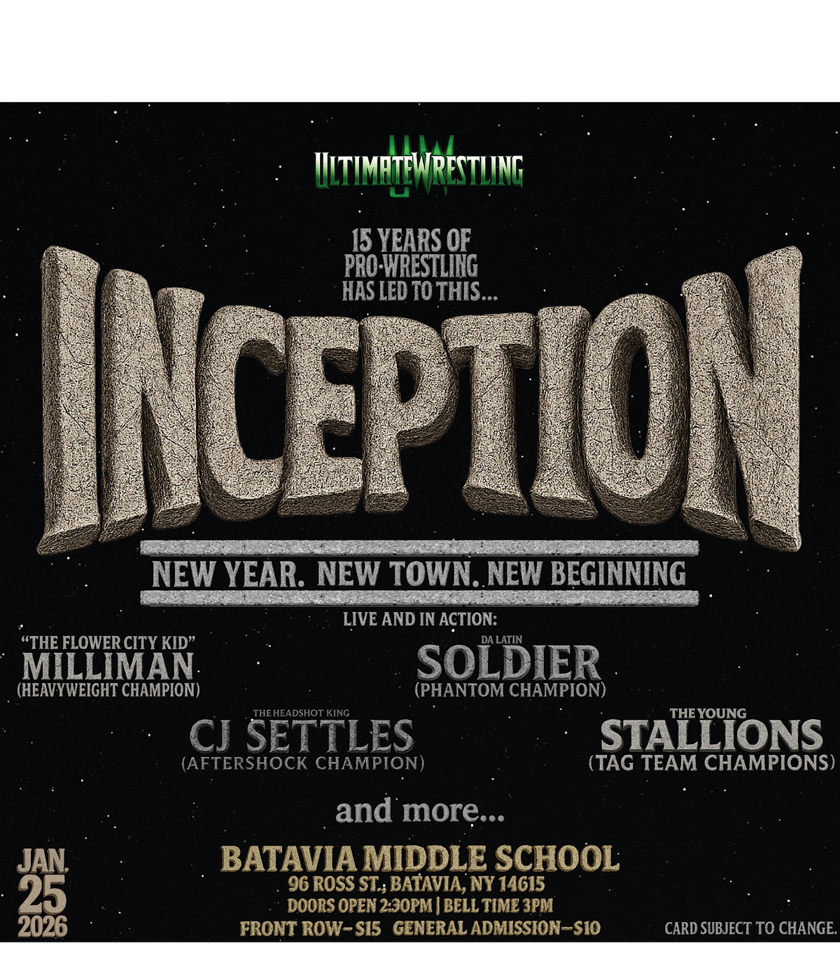 LIVE PRO WRESTLING!!!!!! Ultimate Wrestling heads to Batavia, NY Sunday January 25, 2026. A must see event for children of all ages.About this Event