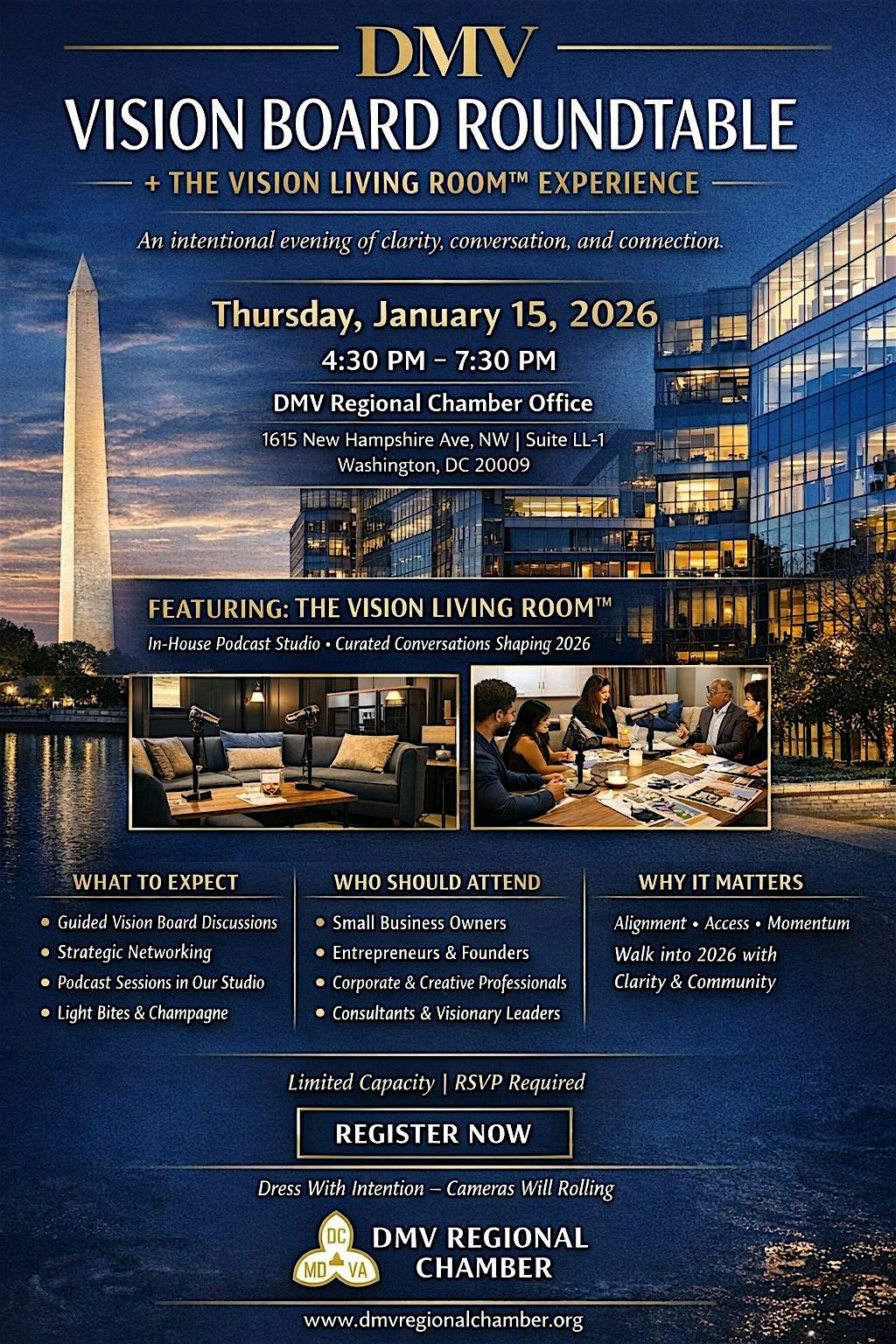 This session is designed to align our regional business community around the DMV’s 2026 vision and amplifying the momentum we are building across two states and the District. Leaders will engage in a focused fireside conversation reviewing the economic outlook of the region, discussing industry trends that will impact local businesses, and sharing actionable takeaways that can strengthen their strategic position. The program will also feature a collaborative Vision Board segment, giving attendees the opportunity to map out their 2026 goals and visually align their priorities with the Chamber’s regional direction. We will close by spotlighting our upcoming membership drive and outlining how organizations can leverage the Chamber’s ecosystem, connections, and customized value to accelerate growth in the new year.