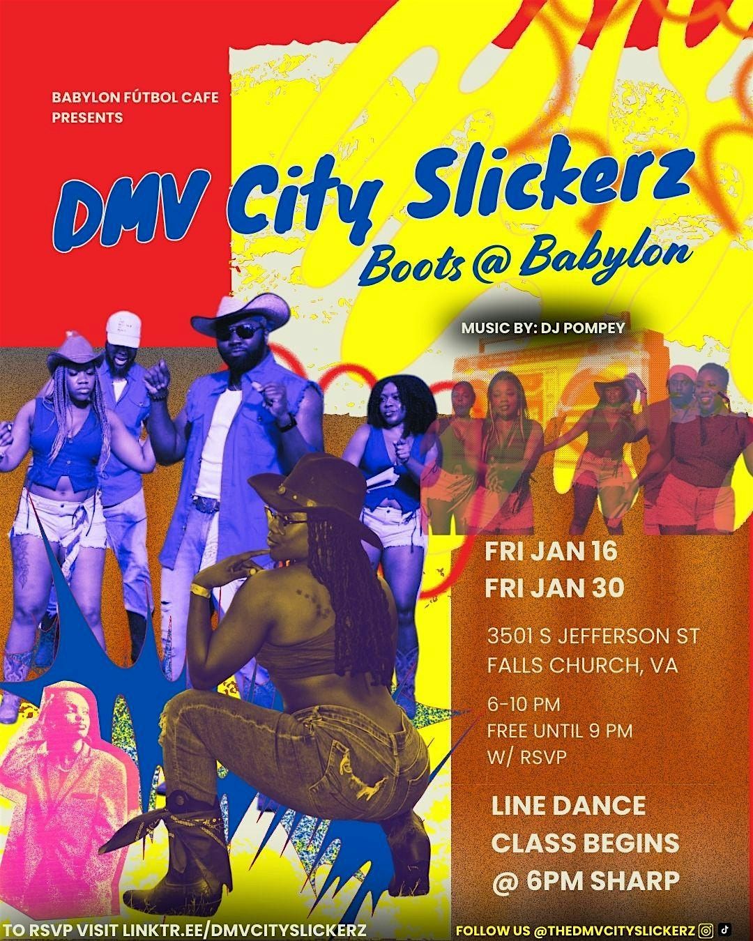 Line dance instruction starts promptly at 6 pm. Entry is free before 9 pm with an RSVP. If you've been to our line dancing in the park events, then you already know the vibes the DMV City Slickerz bring! We can wait to see you! #DMVCitySlickerz