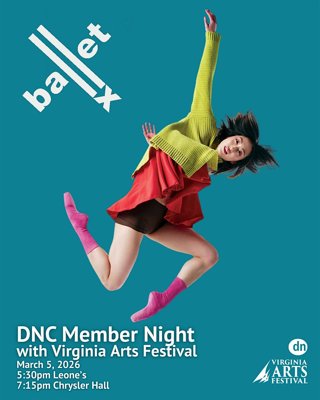 The night starts at Leone’s Italian at 5:30 PM for a pre-show reception. It’ll be a good chance to catch up with everyone, have some snacks and purchase beverages. Then we’ll head over to Chrysler Hall for the BalletX performance at 7:30 PM. As a DNC member you will receive 15% off your tickets.