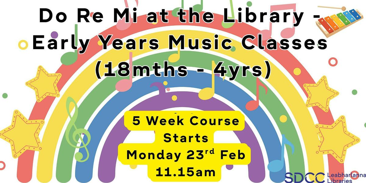 Welcome to Do Re Mi at the Library, Early Years Music Classes! Join us for a fun and interactive music course starting on February 23rd, 2026 at 11.15 AM. Join us for a fun filled introduction to music for babies and young children developing a firm foundation in rhythm, pitch and enjoyment of music.
