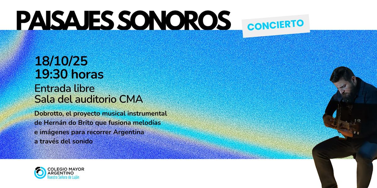"Paisajes Sonoros" no es solo un concierto, es un viaje por los sentidos.Desde la Patagonia hasta el Norte argentino, Hernán do Brito nos invita a recorrer sonidos, emociones y paisajes a través de su proyecto musical Dobrotto. Música instrumental en vivo, proyecciones audiovisuales y un relato que conecta con nuestras raíces.