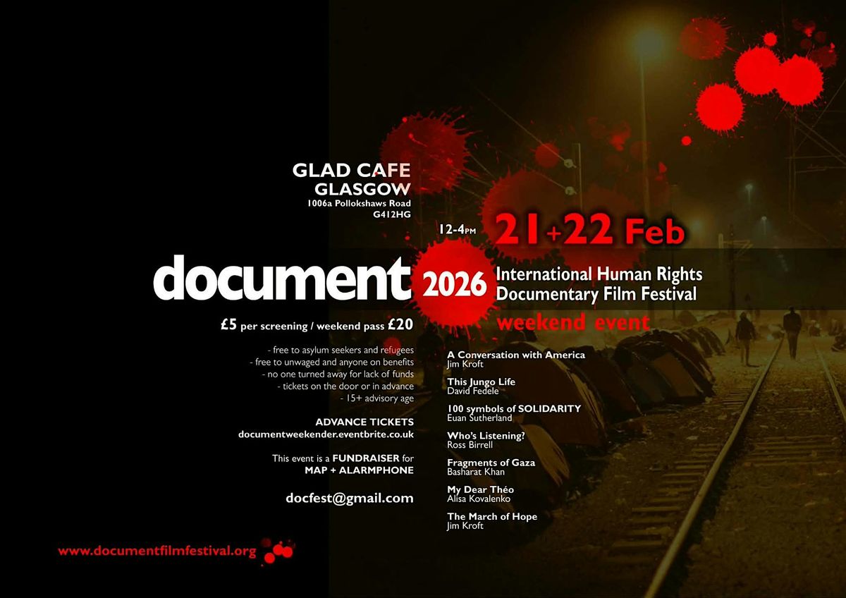 Document's International Human Rights Documentary Film Festival returns for a two-day fundraiser at The Glad Cafe, showcasing documentary cinema on Palestine, Ukraine, borders, and US populism. Scroll down to see our full programme details and listings.
