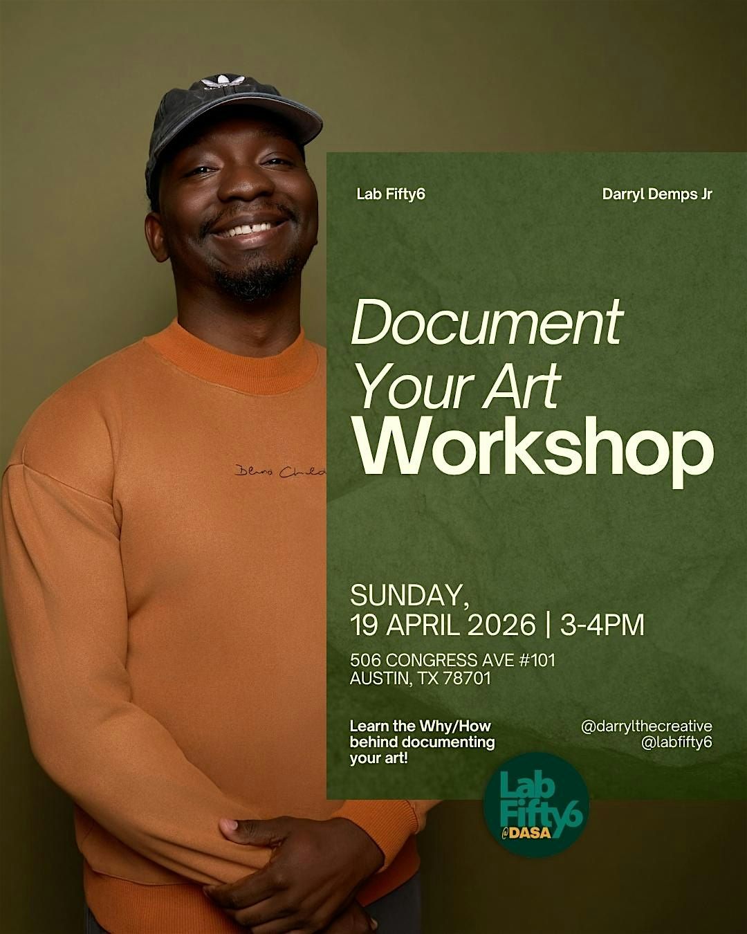 Join us at Lab Fifty6 in downtown Austin for the Art Documentation Workshop. More than a workshop, it’s a talk to inspire you. We’ll dive into the ‘why’ and ‘how’ of showcasing your art to the world. You’ve created it—let’s make sure it’s seen!