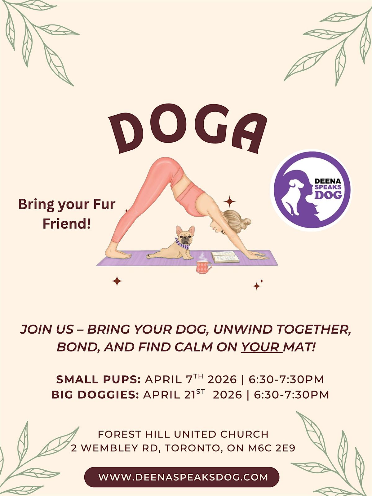 Deena Speaks Dog brings over 30 years of experience as a specialized dog trainer and behaviour expert, and she’s teaming up with a professional certified yoga instructor to guide you through a fun and relaxed session.