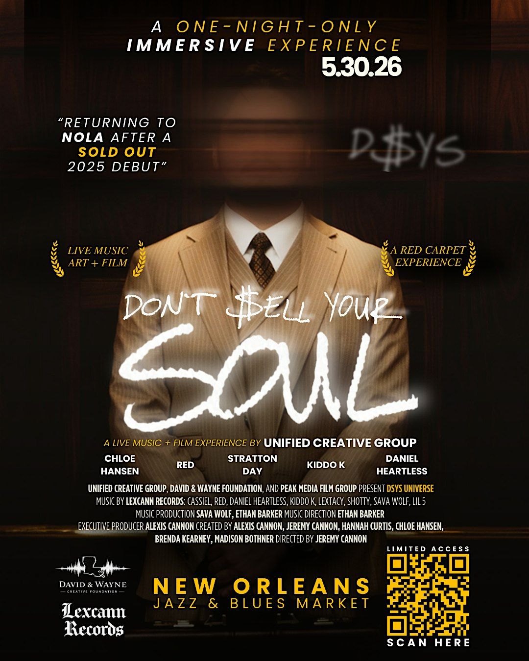 Don’t $ell Your Soul is a one of a kind immersive evening that blends original cinema, live poetry, original music, and theatrical performance into a single unforgettable night. Created entirely by Louisiana artists in collaboration with LexCann Records, this production returns to the New Orleans Jazz Market on May 30, 2026 following a sold out 2025 debut.
