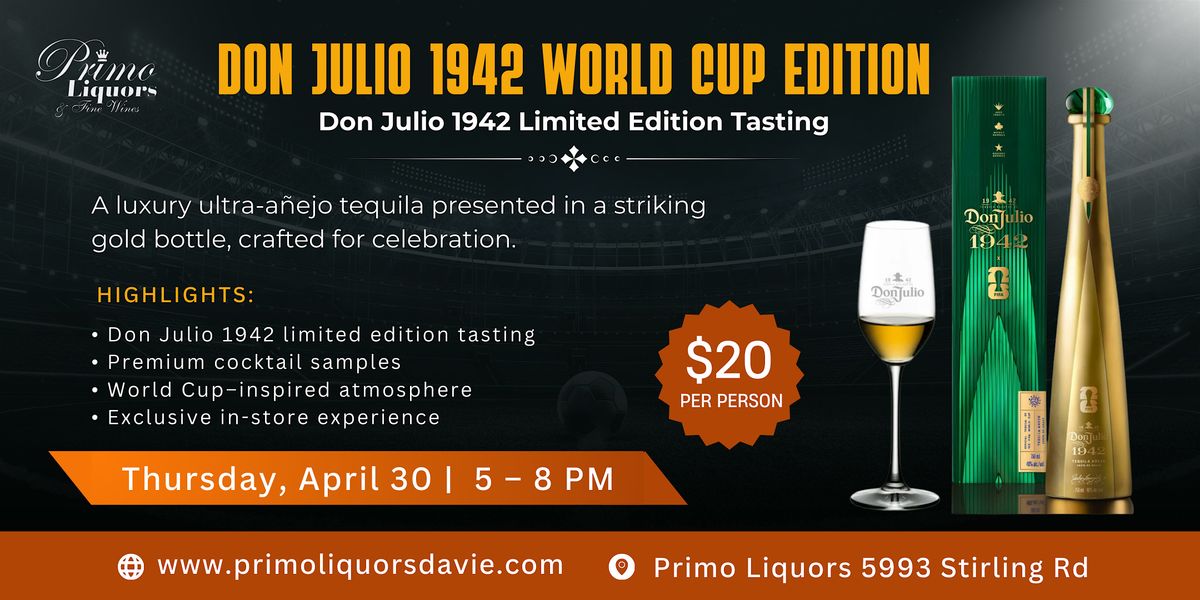Join us for a luxury tasting event featuring the iconic Don Julio 1942 World Cup Edition — an ultra-añejo tequila presented in a stunning gold bottle, crafted for celebration.