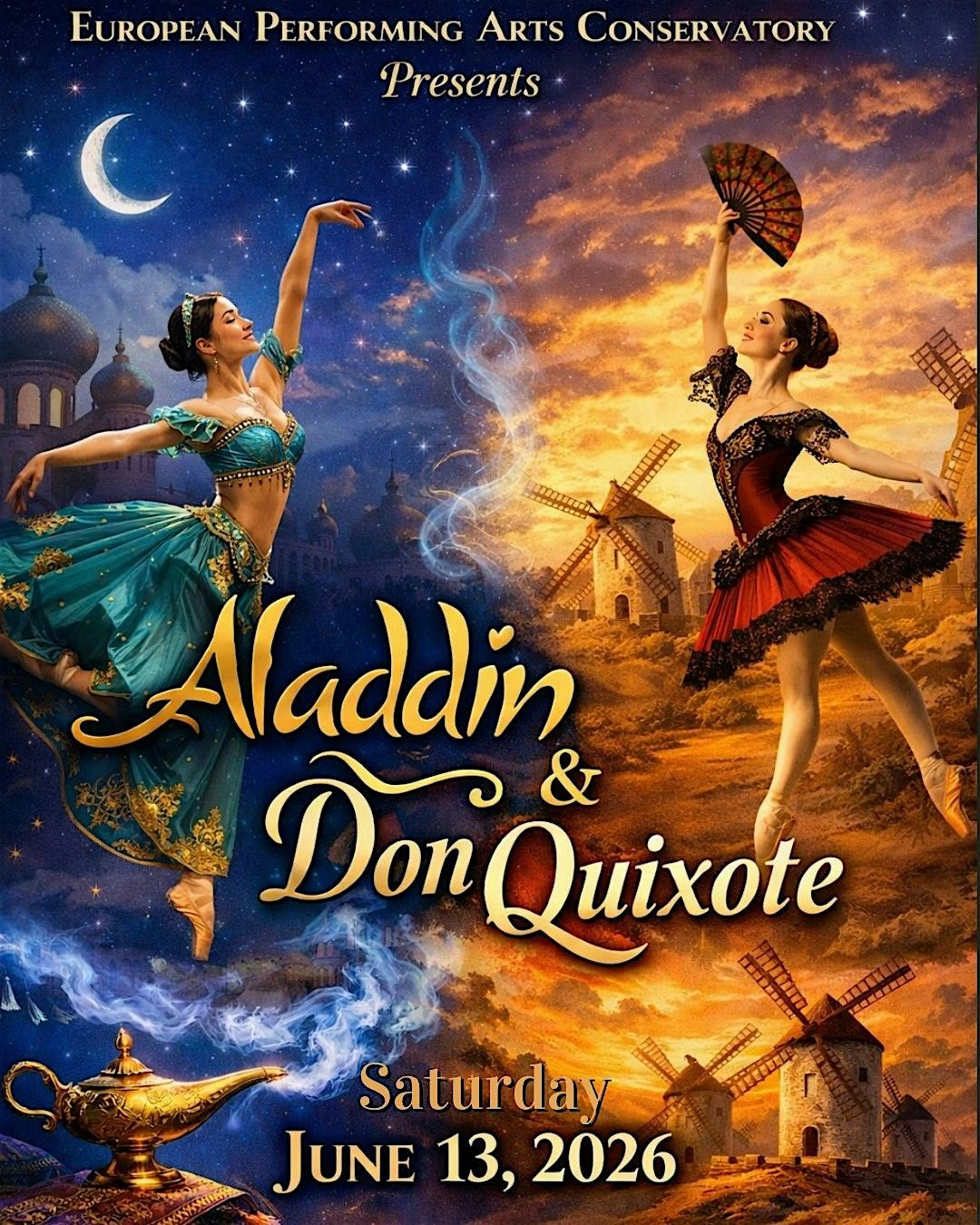 European Performing Arts Conservatory is presenting not just one ballet, but two! The performance begins with a shortened version of the beloved classical ballet Don Quixote, featuring our Pro-Track dancers alongside professional artists. After a brief intermission, Aladdin takes the stage, bringing together all EPAC dancers in a colorful and exciting production filled with adventure and storytelling.