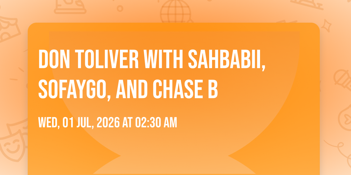 📍 Location: 32.7553, -117.212🌟 Be part of history at Don Toliver with SahBabii, SoFaygo, and Chase B, an extraordinary gathering that will captivate your imagination! 🏛️ The prestigious Pechanga Arena San Diego in San Diego, CA sets the stage for an unforgettable experience on July 1st, 2026 at 02:30 AM. ✨ They are bringing together the finest elements of entertainment and innovation to create moments that will take your breath away. From the moment you arrive, you'll be immersed in an atmosphere of wonder and excitement. 🎯 This carefully planned event ensures every guest experiences something truly special. 🎊 Early booking is recommended for this must-attend event of the season!