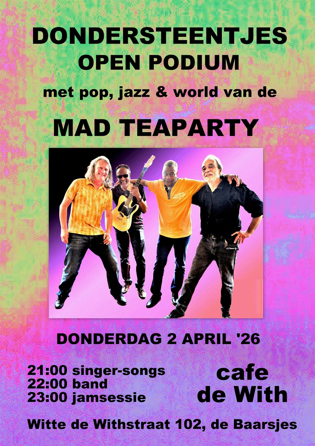 Kom gezellig langs bij het Dondersteentjes open podium, dit keer met de fantastische band Mad Teaparty! Een heerlijke avond vol live muziek, inspiratie en gezelligheid. Dit is jouw kans om in persoon te genieten van gave optredens en nieuwe talenten te ontdekken. Neem je vrienden mee en laat je verrassen door de unieke sfeer!