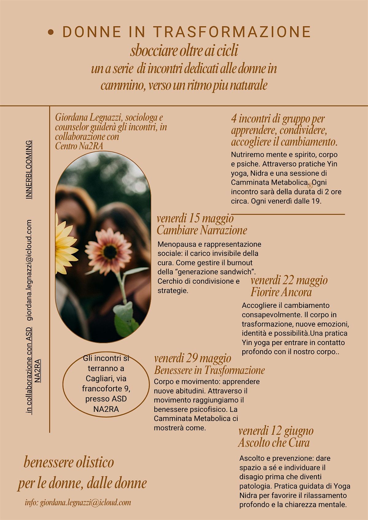 Un percorso di 4 incontri per riconnettersi col proprio corpo, comprendere i cambiamenti, condividere i vissuti, ritrovare equilibrio e centratura. attraverso pratiche integrate di Yin yoga, Yoga Nidra, counseling integrato e Camminata Metabolica. Nutriremo corpo e psiche, in un ambiente non giudicante, tra donne. Ogni incontro durerà 2 h circa. E´ consigliabile completare il percorso ma e´possibile acquistare anche solo un incontro.