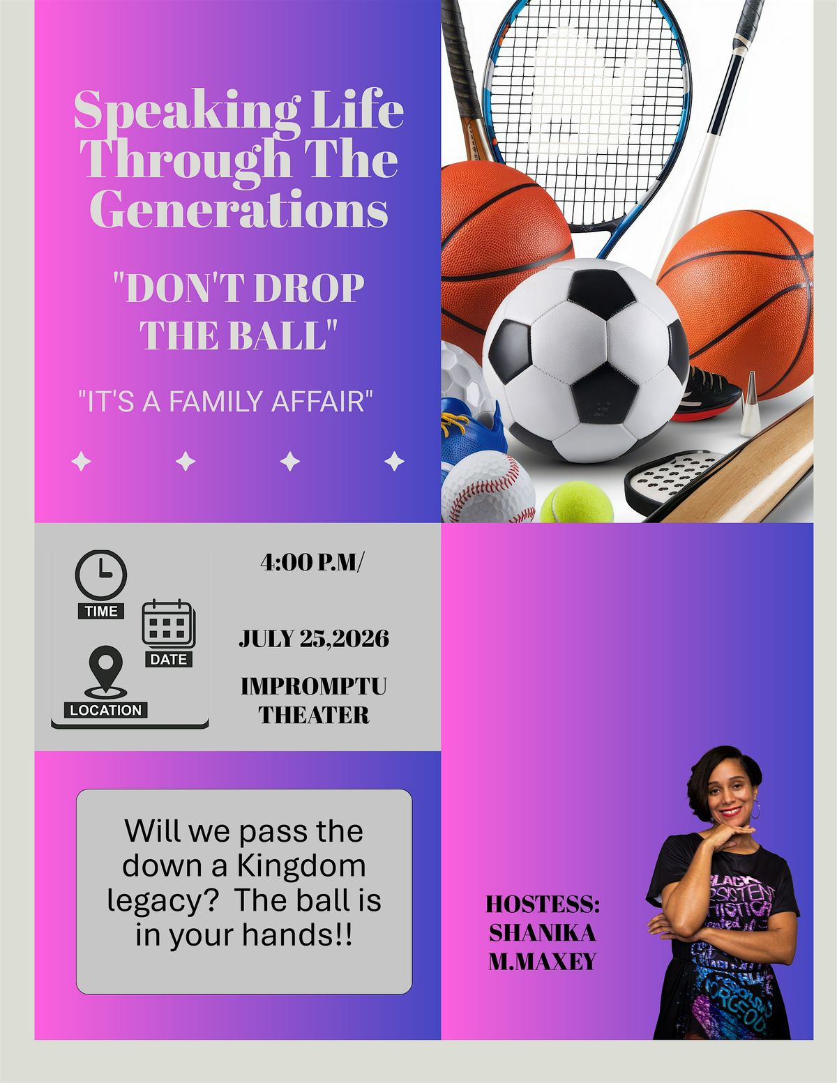 Join us in person on July 25, 2026 at 4:00 PM (Central Time)Don’t Drop The Ball is an inspiring event filled with a night of poetry, dance, and spoken word. It is designed to leave a lasting legacy for future generations. We will speak life until generations to come and have a fun-filled, God-filled night. We will pass the ball to our futue and we will not leave our children behind, for they are part of the kingdom!