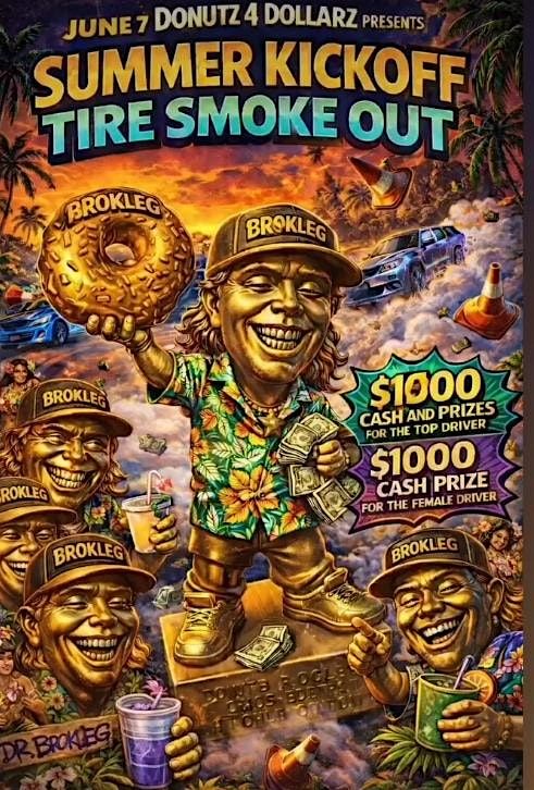 Join us June 6th, for the summer kickoff at Californias largest legal pit feturing two thousand dollar cash prizes! 1,000$ cash prize for best female driver, 1,000$ cash prize ALL GAS NO BREAKS . Join us for a great day filled with sick cars, amazing vendors, and even better company.