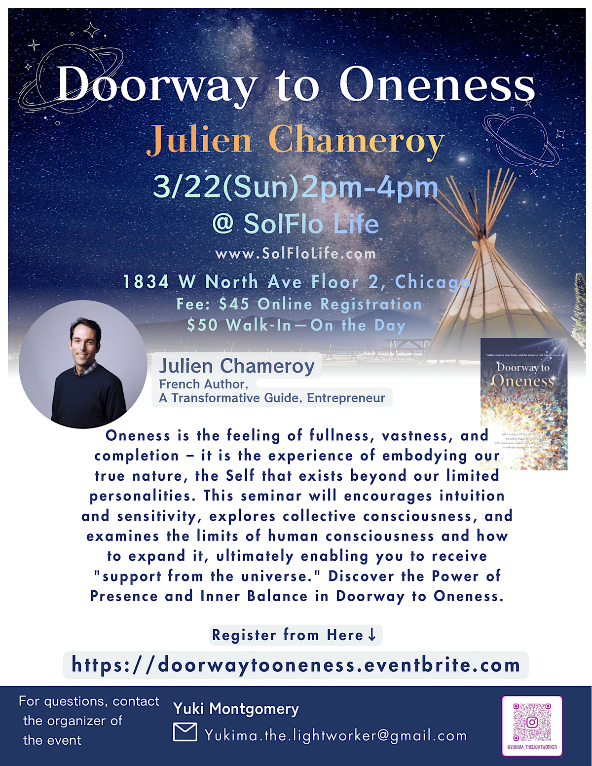 Join French author and transformative guide for a special two-hour experience exploring the themes of his new book Doorway to Oneness. Through an intimate talk and guided exploration, discover the concept of oneness, the feeling of fullness, presence, and connection beyond our everyday identities. Together we’ll explore intuition, collective consciousness, and how to cultivate inner balance and openness to the support of the universe.