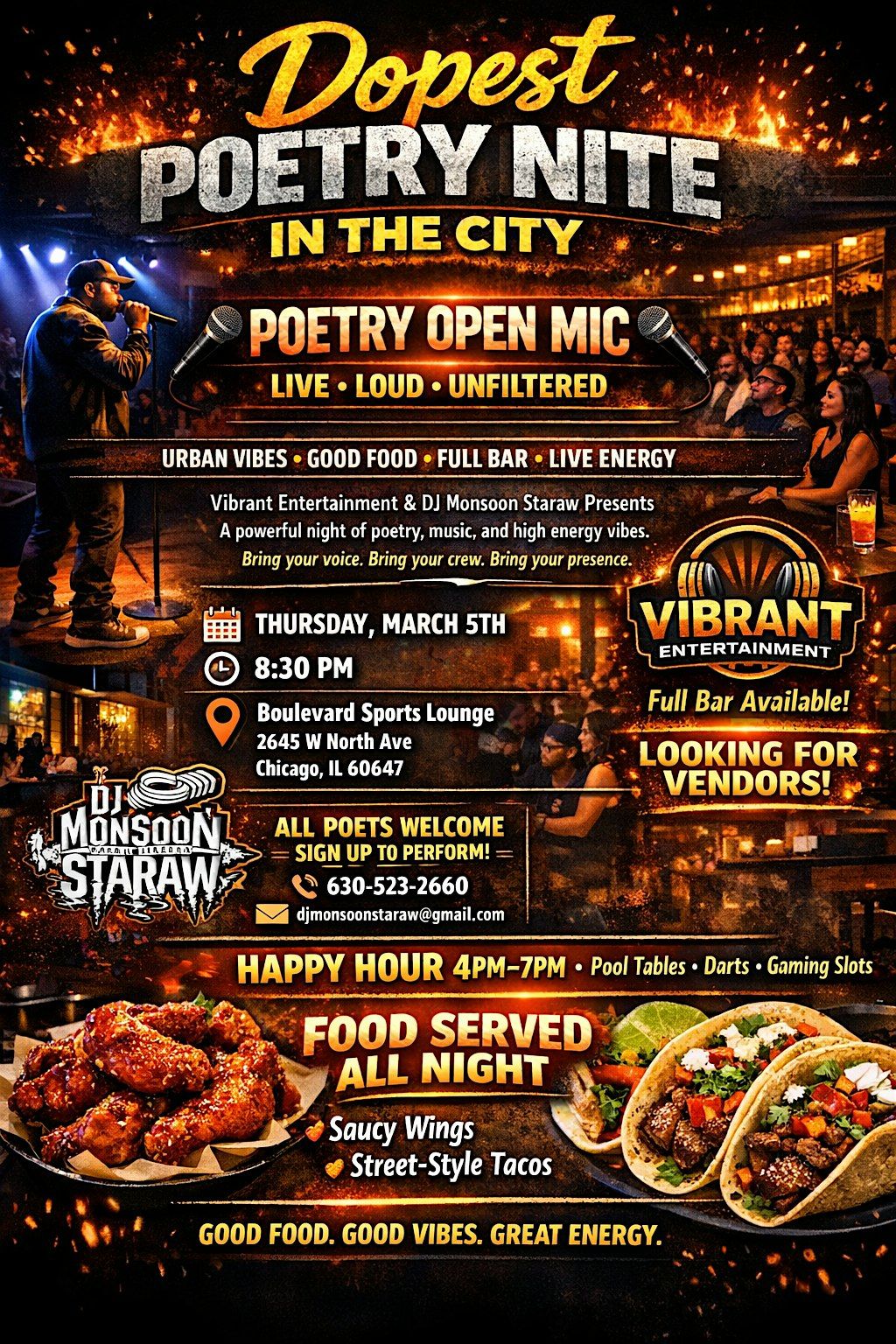 Entertaining, stimulating spoken word. Music provided by international DJ Monsoon Staraw. Drink specials, food served late, no admission.