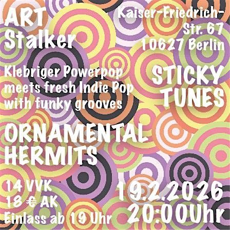 Angeblich werden pro Tag über 100.000 neue Songs ins Netz gestellt. Wer damit überfordert ist, braucht in diesem Ozean der Beliebigkeit Orientierung und eine rettende Insel. Auf dieser haben es sich die vier Bandmitglieder der STICKY TUNES gemütlich gemacht und versorgen erschöpfte Schiffbrüchige mit allem, was das Herz begehrt: Selbst komponierter Power-Pop mit brillanten Melodien, bestechenden Arrangements mit überraschenden Wendungen und anspruchsvolle Lyrics in englisch oder deutsch. Am 19.2.2026 wird die Band im ART Stalker neben den bewährten Titeln von ihrem 2024 erschienenen Album („Gern auch im Regen“) auch schon wieder eine Auswahl mit brandneuem Material präsentieren.