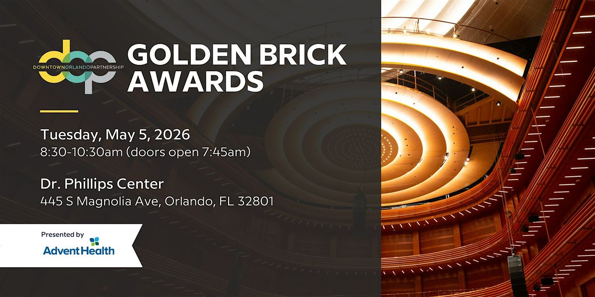The Golden Brick Awards are the Downtown Orlando Partnership’s exclusive annual awards celebrating the people, projects, and initiatives from the previous year that propelled downtown forward. The program also includes the announcement of the “Downtowner of the Year” (DOTY) winner by Orlando Mayor Buddy Dyer. The 2025 Golden Brick Awards, presented by AdventHealth, will take place in Steinmetz Hall at the Dr. Phillips Center on May 5, 2026.