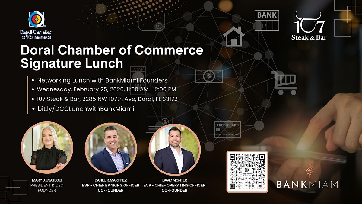 Join us for a unique and interactive networking lunch where business connections take center stage. This exclusive event brings together the Founders and executive team of BankMiami for an engaging conversation with the Doral Chamber of Commerce and the local business community.