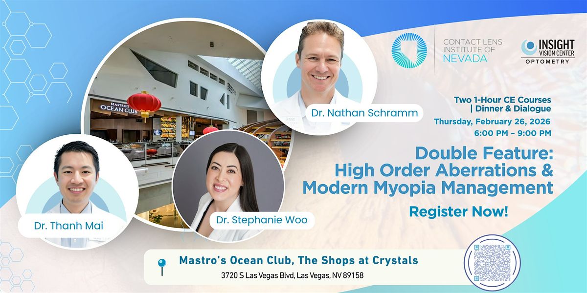 Presenters Dr. Nathan Schramm, OD, FSLS, FBCLA and Dr. Thanh Mai, OD, FSLS are nationally recognized thought leaders in specialty contact lenses, high order aberration care, and myopia management. The evening will also feature Dr. Stephanie Woo, OD, FAAO, FSLS, host and founder of the Contact Lens Institute of Nevada.