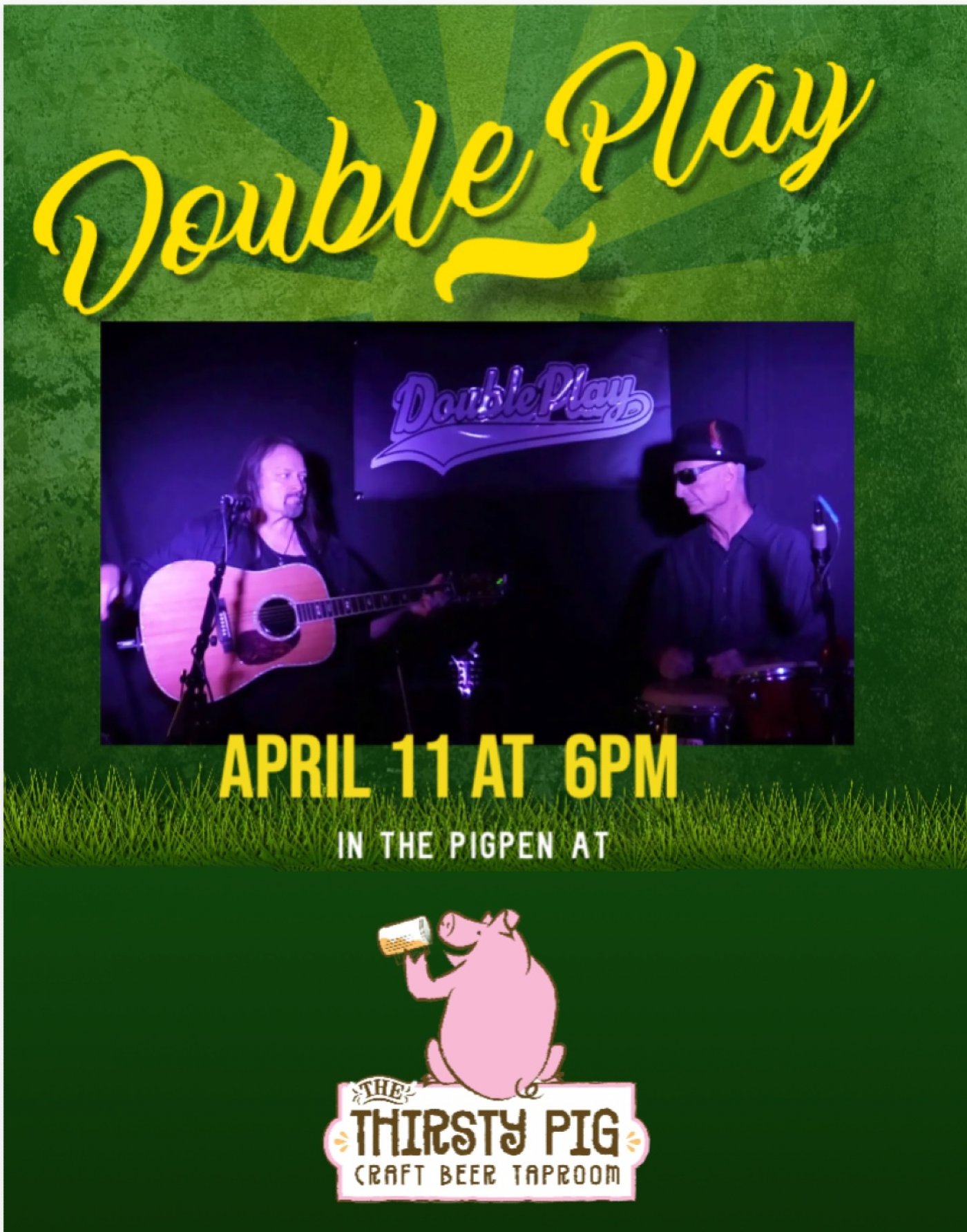 Double Play- A fun duo playing your favorite classic rock in the PigPen at 6PM. Family friendly, pet friendly outside venue. Drinks served 3-9 and the food truck is cooking your favorites from 4-8.