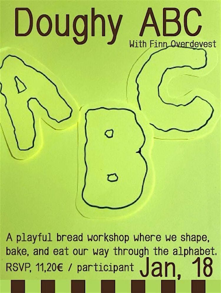 Join us at No Other Option for a playful and experimental, hands-on bread workshop. Using bread dough, participants will shape letters of the Latin alphabet and bake them together. The workshop ends with a shared bread typeface created by everyone.