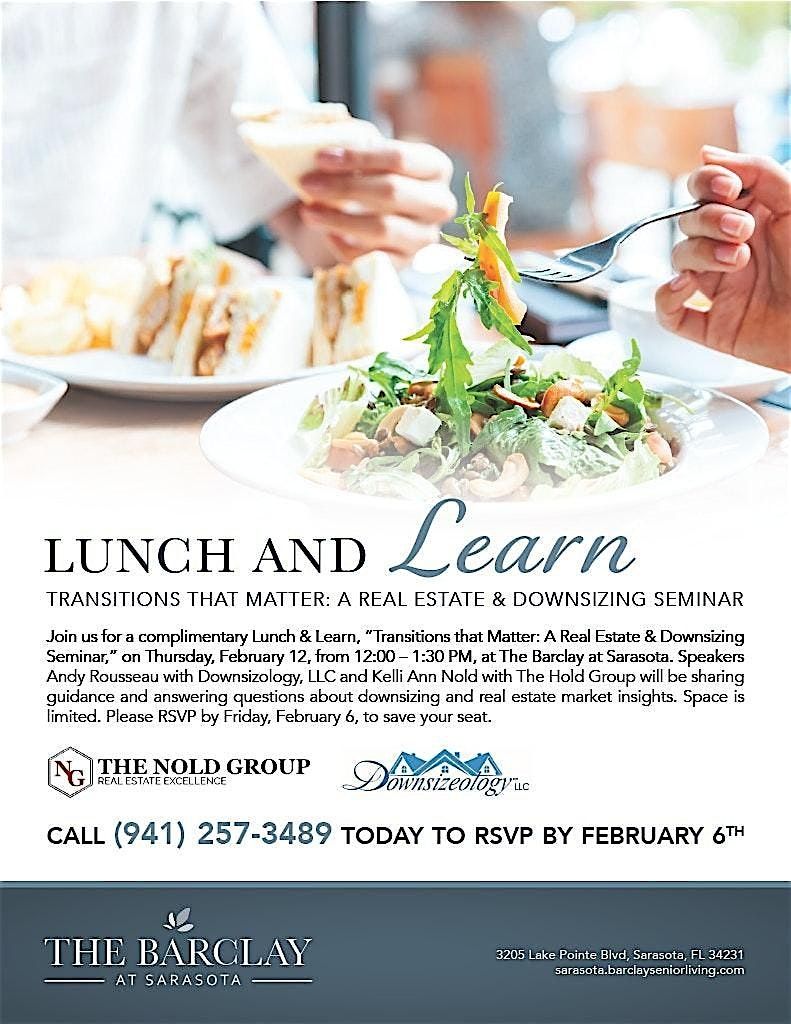 Join us for a complimentary Lunch & Learn, “Transitions that Matter: A Real Estate & Downsizing Seminar,” on Thursday, February 12, from 12:00 – 1:30 PM, at The Barclay at Sarasota. Speakers Andy Rousseau with Downsizology, LLC and Kelli Ann Nold with The Hold Group will be sharing guidance and answering questions about downsizing and real estate market insights. Space is limited. Please RSVP by Friday, February 6, to save your seat.
