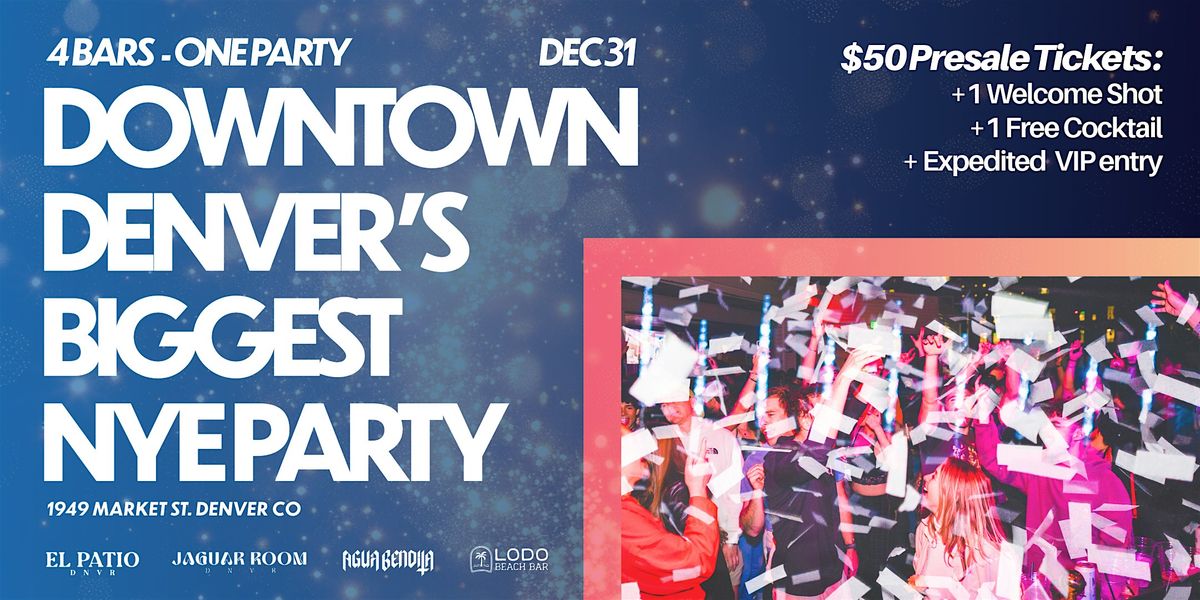 Welcome to DOWNTOWN DENVER'S BIGGEST NYE PARTY at El Patio! Get ready to ring in the New Year in style on December 31, 2025 at 10:00 PM (Mountain Time). Join us for a night of music, dancing, and unforgettable moments. Don't miss out on the hottest party in town! See you there!