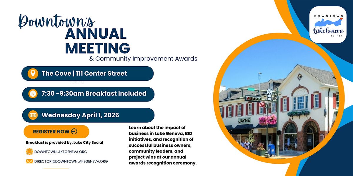 Join the Downtown Lake Geneva Business Improvement District (BID) for its Annual Meeting & Community Improvement Awards to learn more about the BID's mission, its accomplishments for the year, and its plans for the upcoming year while celebrating innovation, partnership, and community betterment!
