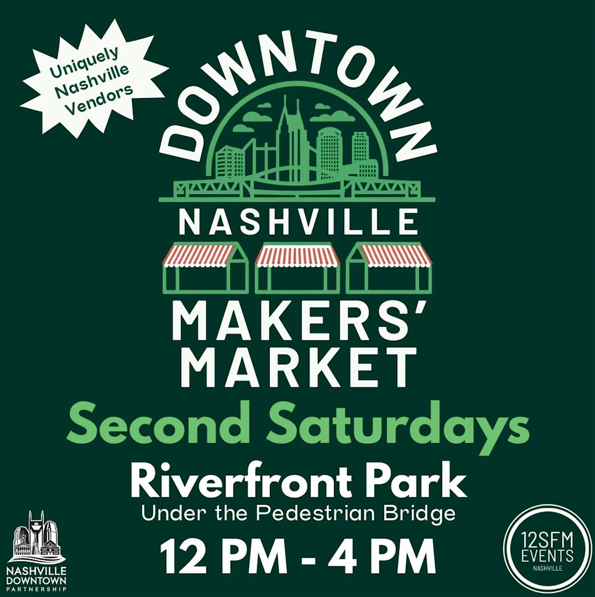 Come downtown to support your small local business owners! Stop by the Downtown Nashville Makers' Market, hosted by the 12SFM Events Team. Held on the 2nd Saturday of each month at Riverfront Park under the Pedestrian Bridge, this market will feature uniquely Nashville vendors, live music, hot food and cool beverages!