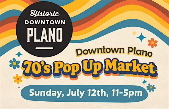 Step back in time and shop local at the 70’s Pop-Up Market in the heart of Downtown Plano! Join us on Sunday, July 12th from 11 AM–5 PM for a groovy day filled with vintage vibes, unique finds, and a fun community atmosphere.