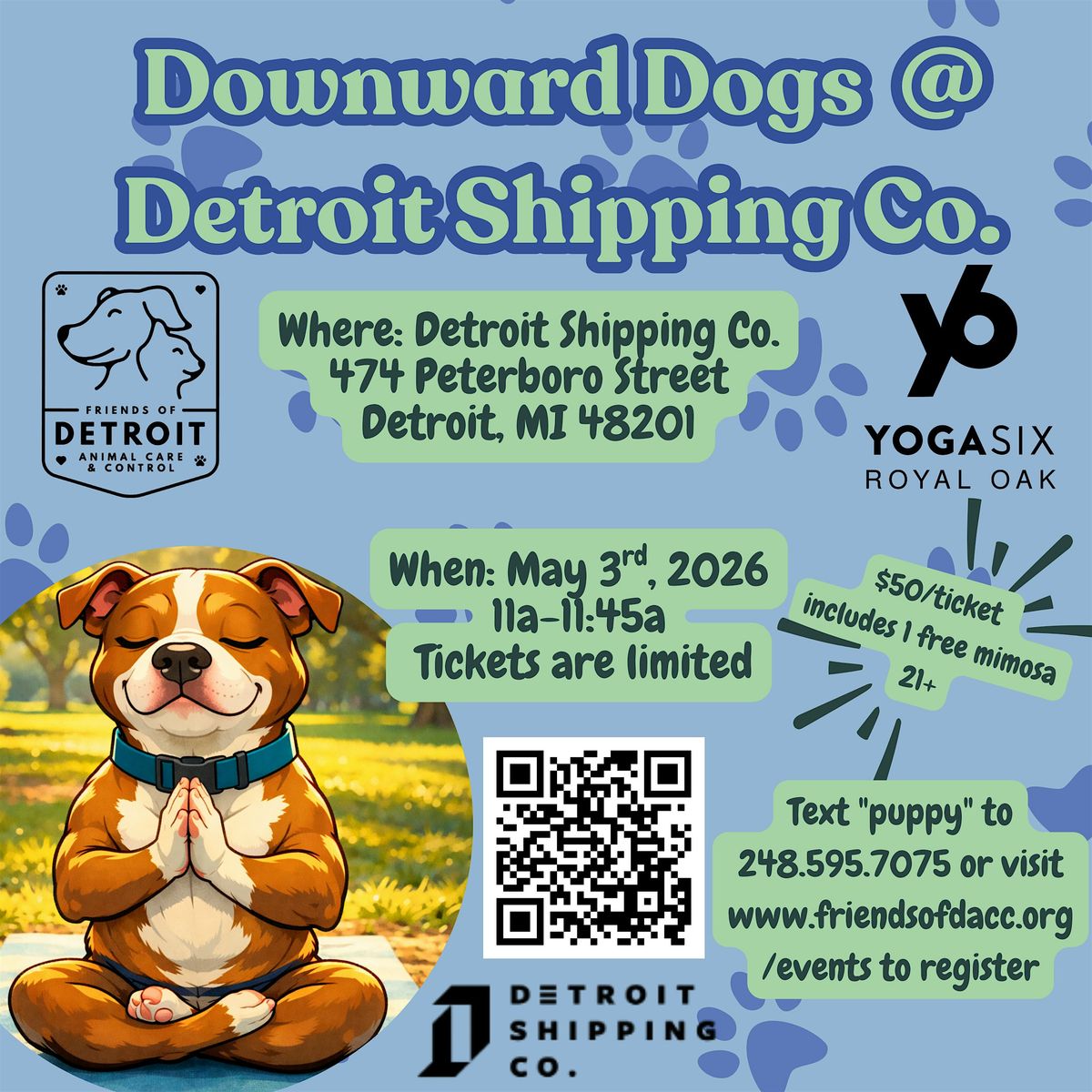 Join YogaSix Royal Oak at Detroit Shipping Company for a fun, all-levels yoga class featuring adoptable dogs from Friends of DACC as part of Bark in the Yard. Enjoy a light, beginner-friendly flow while interacting with adorable pups—and maybe meet your new best friend. Stick around after class for a complimentary mimosa!