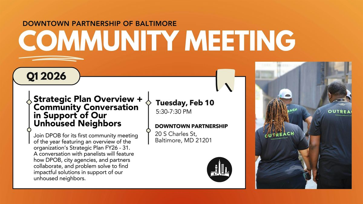 Join Downtown Partnership of Baltimore (DPOB) for its first community meeting of the year featuring an exclusive first look at our updated Strategic Plan FY26 – 31, which redefines our vision, mission, and values to better serve Downtown Baltimore. A panel discussion will also take place on how DPOB, city agencies and partners collaborate, and problem solve to find impactful solutions in support of our unhoused neighbors.