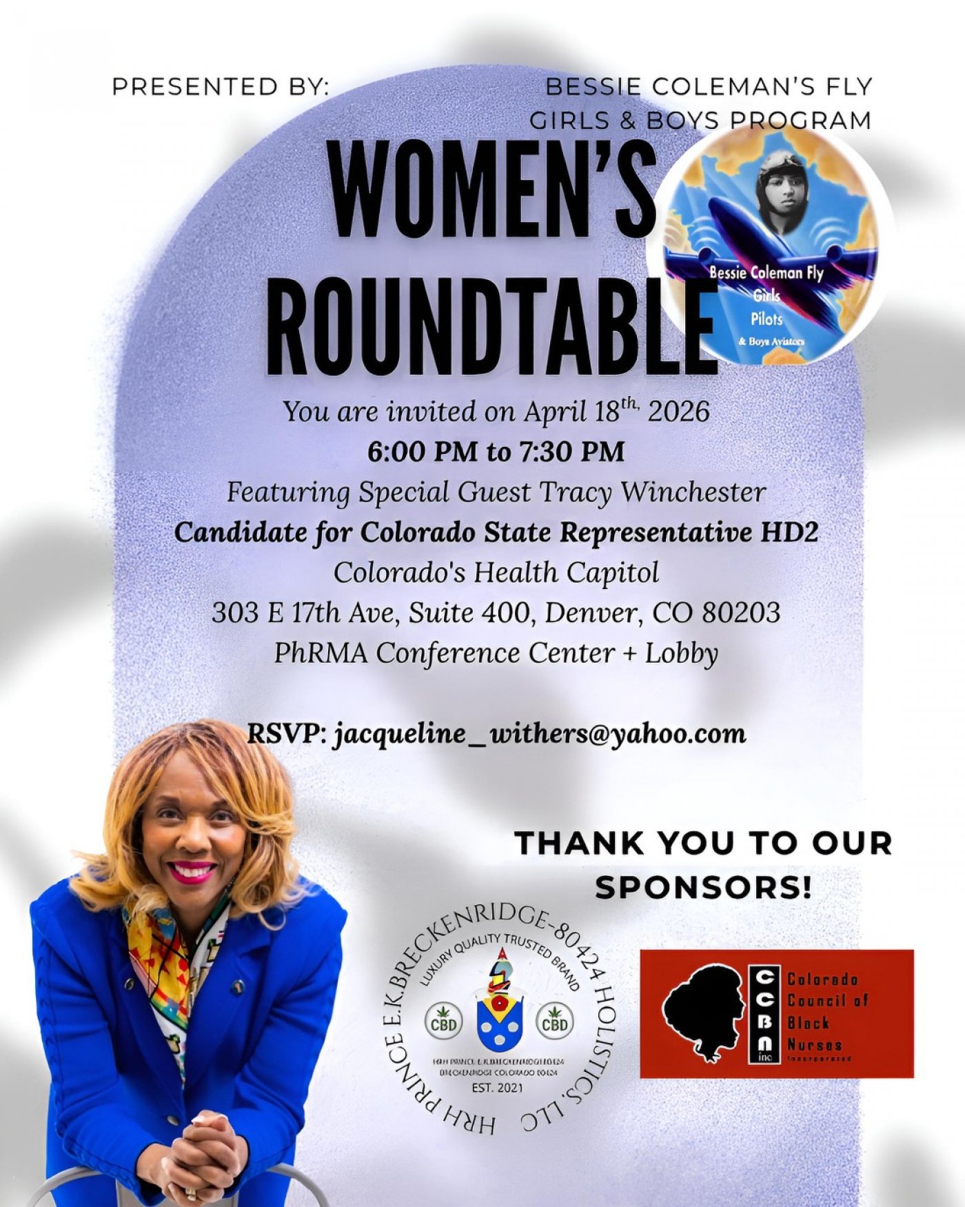 Dr. Jacqueline Withers PhD presents: Womens Roundtable! Featured Guest Speaker: Tracy Winchester Candidate for Colorado State House of Representive HD2 Official Sponsors: HRH Prince EK.Breckenridge80424 Holistics LLC & CCBN