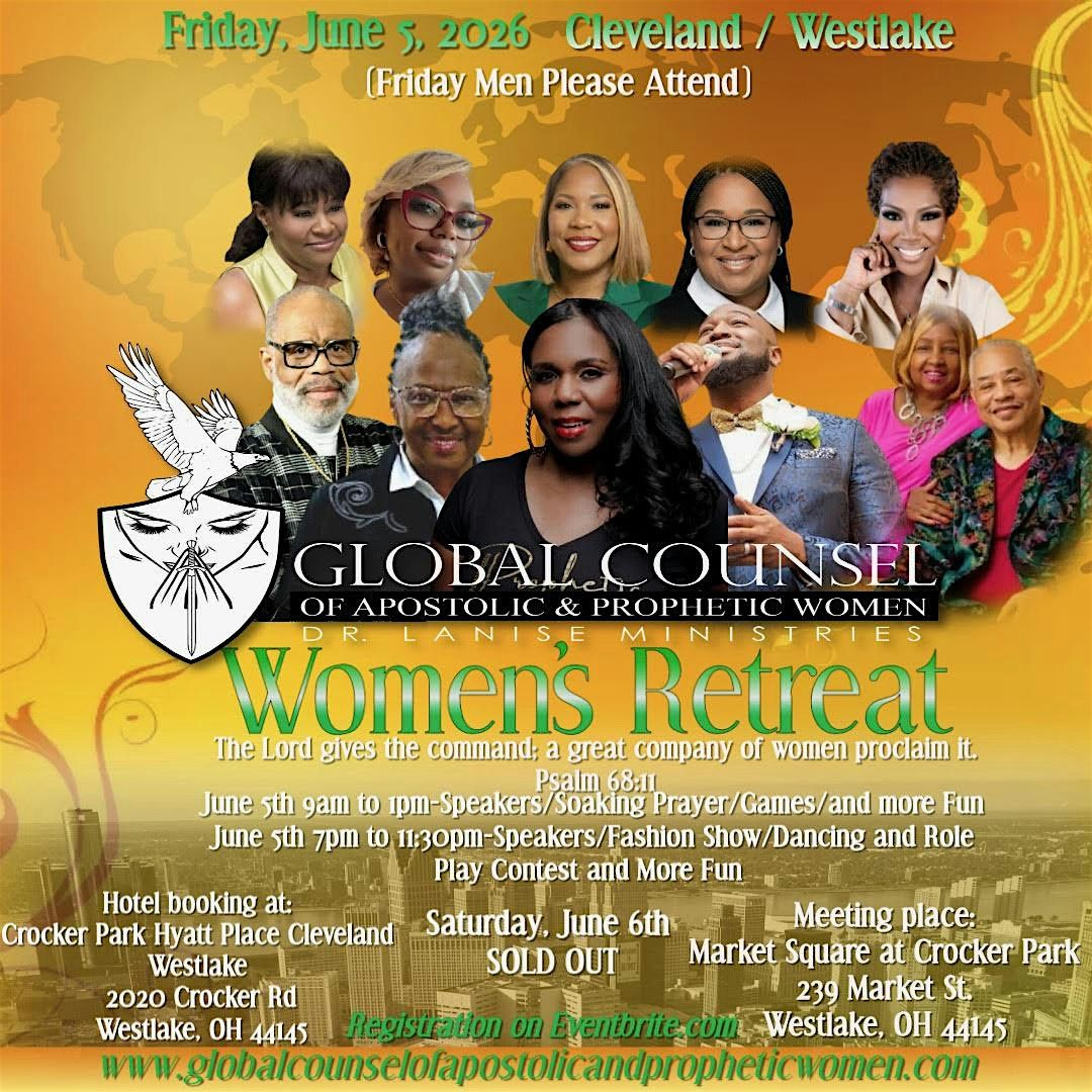 Get ready for an empowering and refreshing experience at the Global Counsel of Apostolic and Prophetic Women retreat. This in-person event is all about connection, inspiration, and growth with amazing women from around the world. We will start at 9am to 1PM. Then enjoy lunch and shopping at the premier Crocker Park District. Then we will meet from 7PM to 11:30PM with teaching, a fashion show, dance competition, and much more fun! Come enjoy one of the number one shopping districts voted in the United States. Dr. LaNise hopes to see you there as her goal is the Restoration of the Sisterhood!