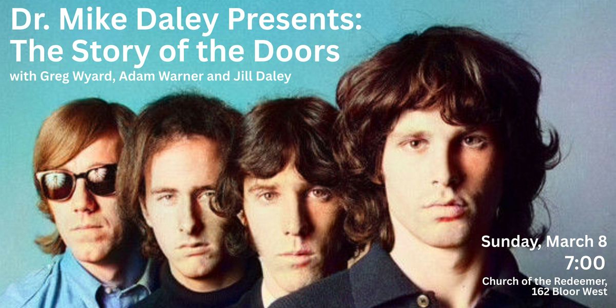 With hits like "Light My Fire," "Riders On The Storm" and "Break On Through," the Doors are one of the most beloved rock groups of all time. Dr. Mike Daley Presents: The Story of the Doors is an entertaining lecture-concert celebrating their career and music, featuring Mike on guitar and vocals, Greg Wyard on bass and vocals, Adam Warner on drums and vocals, and Jill Daley on piano and organ.