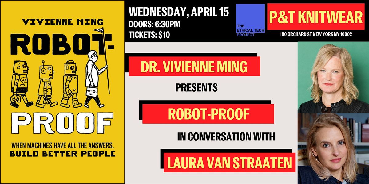 Please join P&T Knitwear and the Ethical Tech Project for an evening with Dr. Vivenne Ming, author of the new book Robot Proof: When Machines Have All the Answers, Build Better People (Wiley, 2026). Dr. Ming is a theoretical neuroscientist researching artificial intelligence and how people - and society- can harness AI to thrive, without sacrificing our humanity. She has been named one of BBC's "100 Women" and one of Inc. Magazine's "10 Women to Watch" and is a frequent speaker on the global stage. She will be in conversation with journalist Laura van Straaten, who has interviewed many important figures of our time while covering culture, education and news for The New York Times, NBC and CNN and many major magazines in the U.S and abroad.