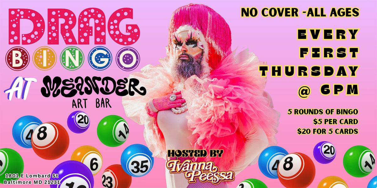 ATTENTION BALTIMORE! THIS IS NOT A DRILL! DRAG BINGO AT MEANDER ART BAR! Hosted by Camp Wannakiki star Ivanna Peessa. Every first thursday of the month at 6pm. Located at your favorite art bar in Upper Fells Point. Enjoy cocktails/mocktails, a deliciously curated menu, 5 rounds of bingo, watch FABULOUS local drag entertainers and win prizes!!! (Win an extra special prize at the last round đŸ¤«) NO COVER! ALL AGES EVENT!