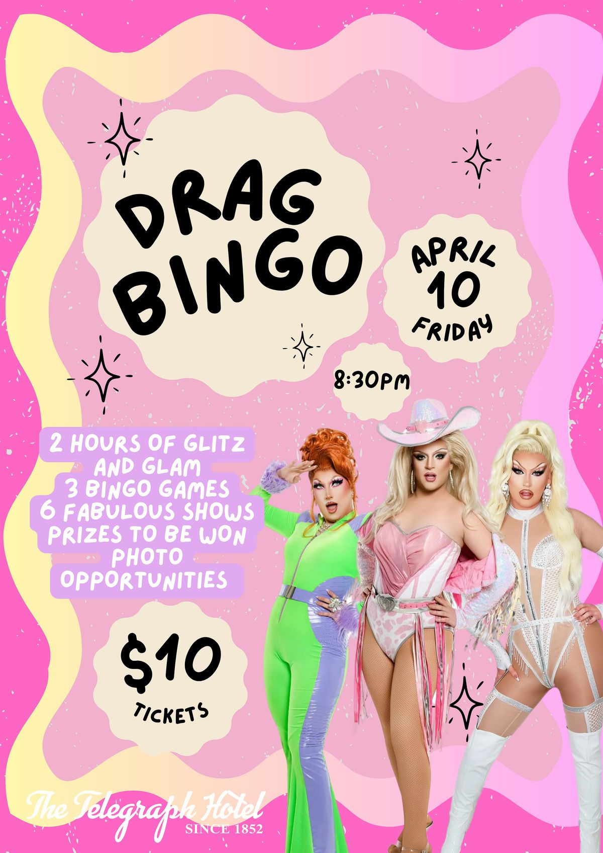 Get ready for an unforgettable night of glitz, glam, and fabulous fun at Drag Bingo on Friday April 10th at 8:30 PM at the iconic Telegraph Hotel Gisborne!