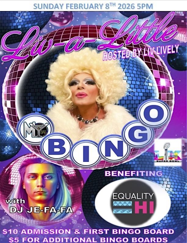 SUNDAY FUNDAY DRAG BINGO - Come join your hostess Ms.Liv Lively raise some funds for EQUALITY HI while having the best Sunday Funday here at My Bar Kona! DOORS open early @ 1PM to watch the SUPERBOWL and Bingo starts after 5 pm sharp. One Bingo card provided upon checkin and addition cards are available with a donation to our local non-profit of the month at the event!