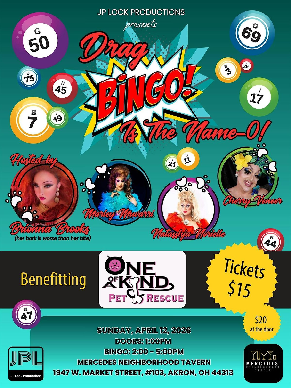 Join us for a barking fun Sunday Funday with some of Akron's fiercest drag entertainers as we help raise money for one of Akron's favorite non-profit organizations - One of a Kind Pet Recue! Hosted by the fierce and fabulous, Brionna Brooks, and joined by local favorites - Cherry Veneer, Natasshja Norielle and Miss Gay Akron 2025, Marley Muvarri! Whether you’re here to win, support our furry friends in need or just to enjoy the show, Drag BINGO Is the Name-O! promises laughs, barks, meows, surprises, and plenty of purrrrefectly sassy vibes.