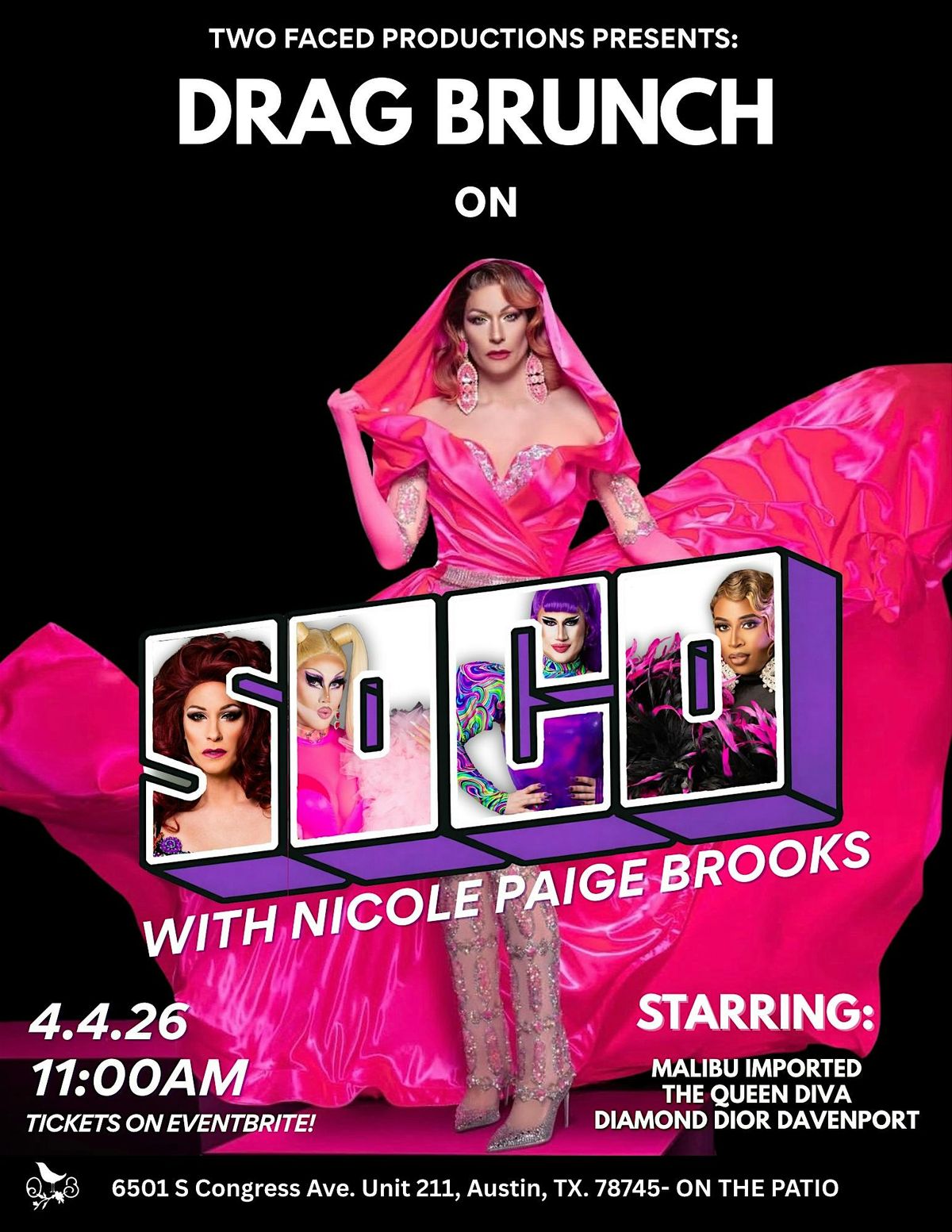 From RuPaul’s Drag Race Season 2 and All Stars 10, Nicole Paige Brooks (From Atlanta, Georgia) joins a special installment of Drag Brunch on SOCO . With performances from Austin Drag Superstars- Malibu Imported, The Queen Diva, and Diamond Dior Davenport !