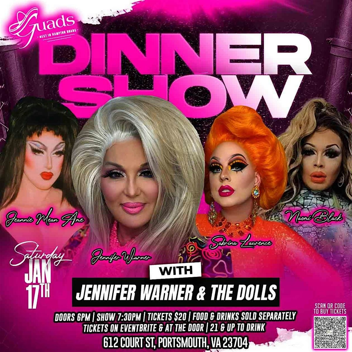 Join us Saturday January 17th for Drag dinner show at Guads Olde Towne Portsmouth 7:30pm showtime with jennifer Warner & the dolls