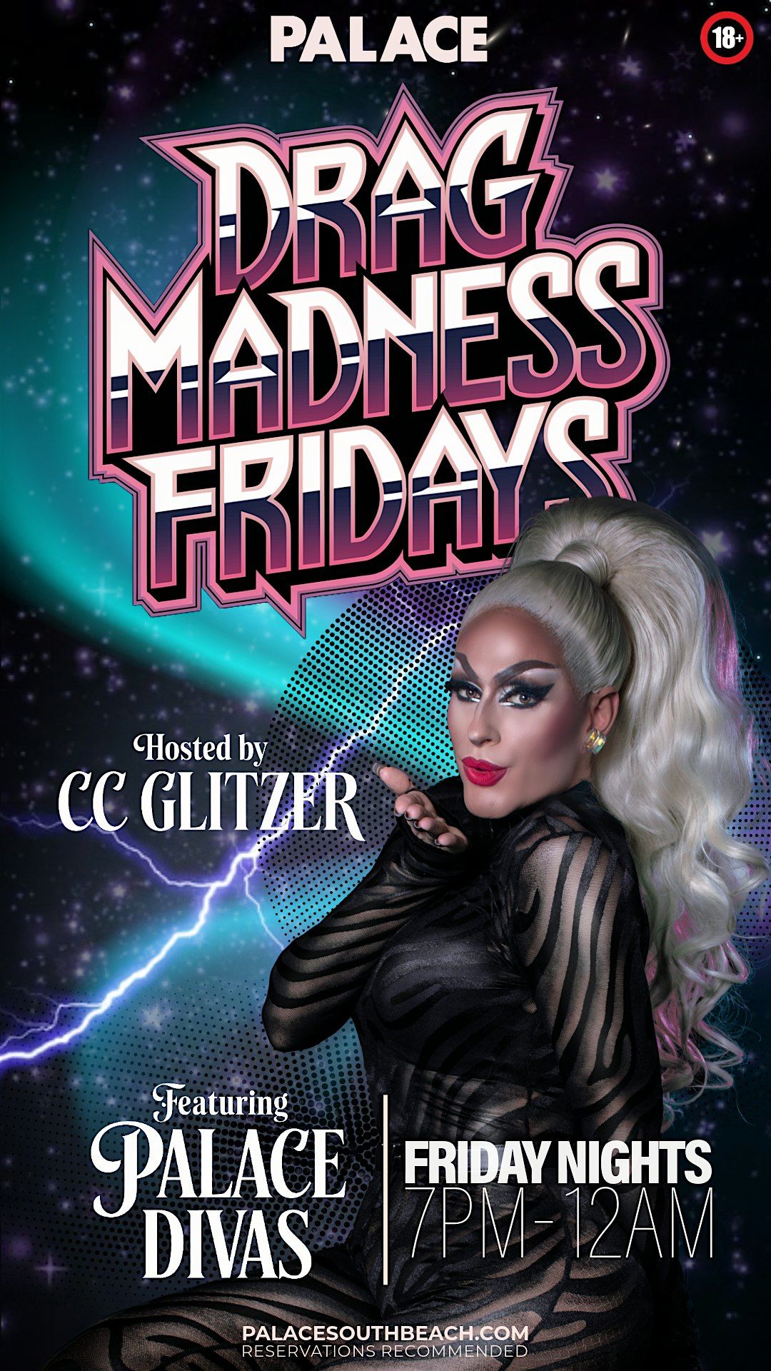 Drag Madness Fridays 7PM-12AM at Palace. Hosted by CC Glitzer with the Palace Divas. Start the weekend loud on Ocean Drive.