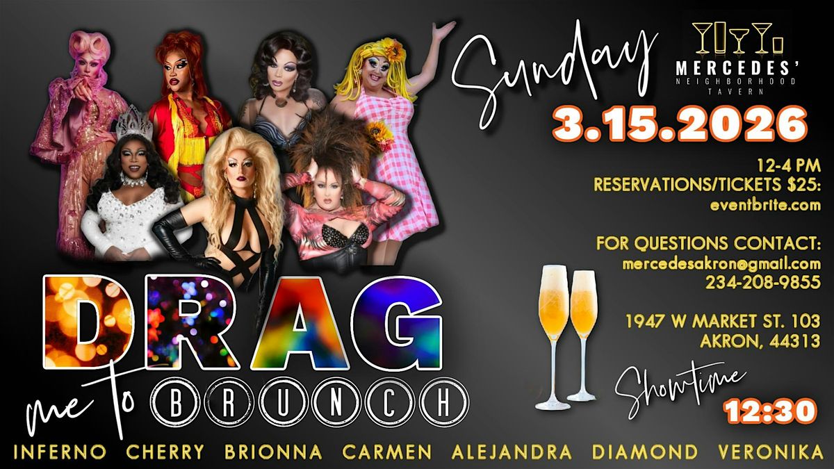 Drag Me to Brunch! Get ready for a fabulous time at Drag Brunch at Mercedes' Tavern! Join us for an afternoon of entertainment, delicious food, and great company at Mercedes' Neighborhood Tavern. Our talented drag performers will keep you entertained while you enjoy a scrumptious brunch. Don't miss out on this unforgettable experience! Ticket price includes brunch buffet and admission! Hosted by Veronika Katrell with special guests: Brionna Brooks, Diamond Devine, Lady Inferno, Carmen LaShon Dupree, Alejandra J Love, and Cherry Veneer!