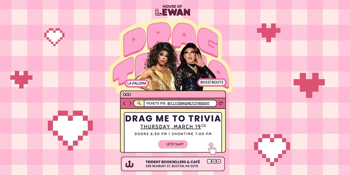 Get ready for a night full of laughs and brain-busting fun! Join us in person at Trident Booksellers & Cafe for Drag Me To Trivia. Bring your friends, grab delicious food and drinks, and enjoy fabulous drag performances that'll keep you entertained all night. Don't miss out on this unforgettable evening!