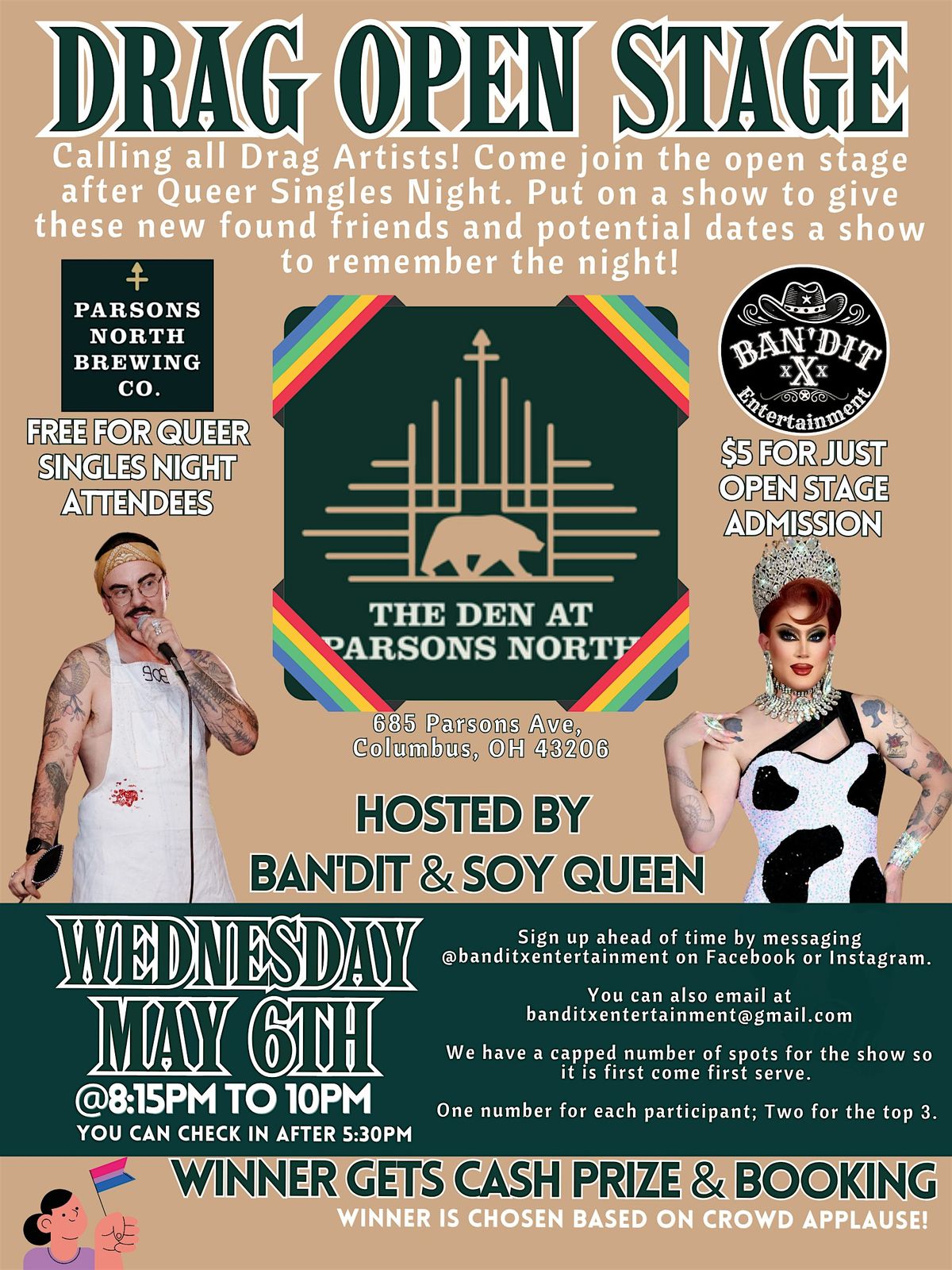 Get ready for a fabulous night at The Den by Parsons North Brewing Company ! This is your chance to shine or cheer on amazing performers at our in-person Drag Open Stage. Whether you're a seasoned queen or just looking for some dazzling entertainment, the vibe's gonna be electric. Bring your friends, bring your energy, and let's make magic happen live!